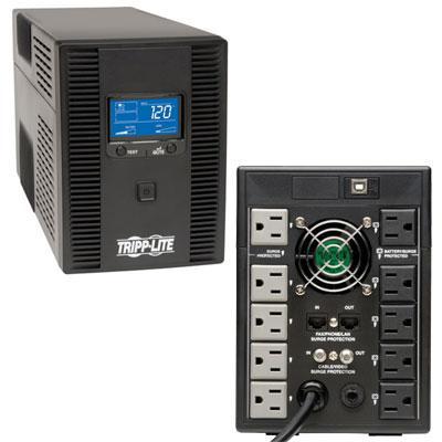1500VA UPS LCD Battery Back Up Tower AVR 120V USB Coax RJ45. OMNI1500LCDT. Tripp Lite’s OMNI1500LCDT Line-Interactive Tower UPS System offers voltage regulation, surge suppression and long-lasting battery support for personal computers, network workstations, home entertainment systems and media centers. Internal UPS circuits support entry-level PCs or individual VCR/DVR components during power failures. Prevents data loss, viewing interruptions, lost recordings and loss of component programming. Automatic Voltage Regulation (AVR) circuits continuously regulate brownouts and overvoltages from 92V to 150V back to usable levels, all while maintaining a full battery charge. Offers complete power protection in an attractive all-black cabinet design. Includes 10 built-in outlets, 5 with full battery backup and surge suppression for vital system components and another 5 with surge-suppression only for accessories not requiring battery support. Built-in USB port and included cable enables optional unattended system shutdown without data loss in case of extended power failure. PowerAlert software is available via free download from www.tripplite.com. HID-compliant USB interface also enables integration with built-in power management and auto shutdown features of Windows and Mac OS X. Built-in surge dataline surge suppression jacks protect equipment with single-line dialup/DSL or network Ethernet connection. Built-in audible alarm and large LCD front panel display offers easy to read icon-based status indicators and detailed numeric data regarding input voltage, output voltage, frequency, load percentage, load watts, battery voltage and runtime in minutes. 1500VA/810W power-handling capacity supports entry-level PCs, home entertainment systems, network workstations and audio/video components.