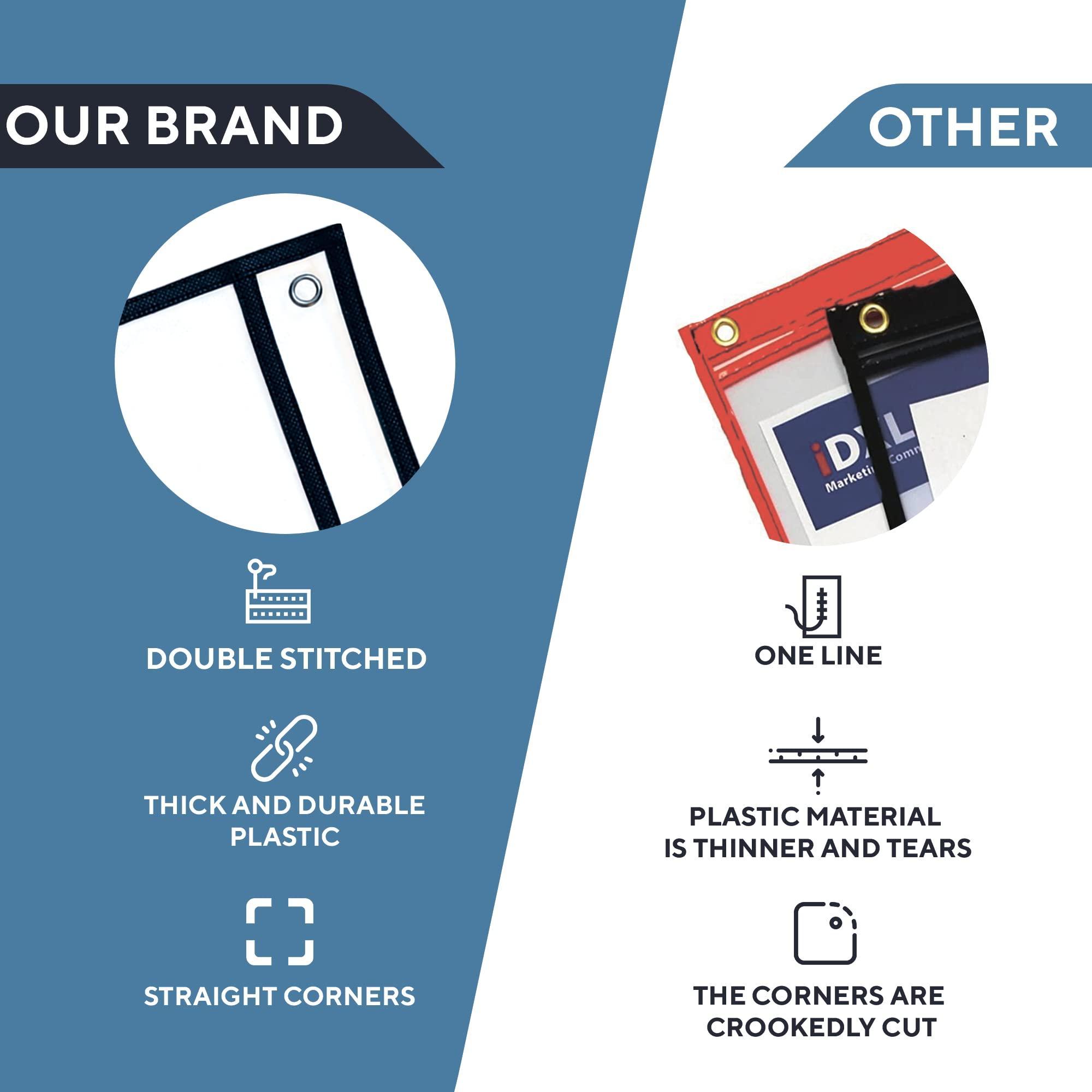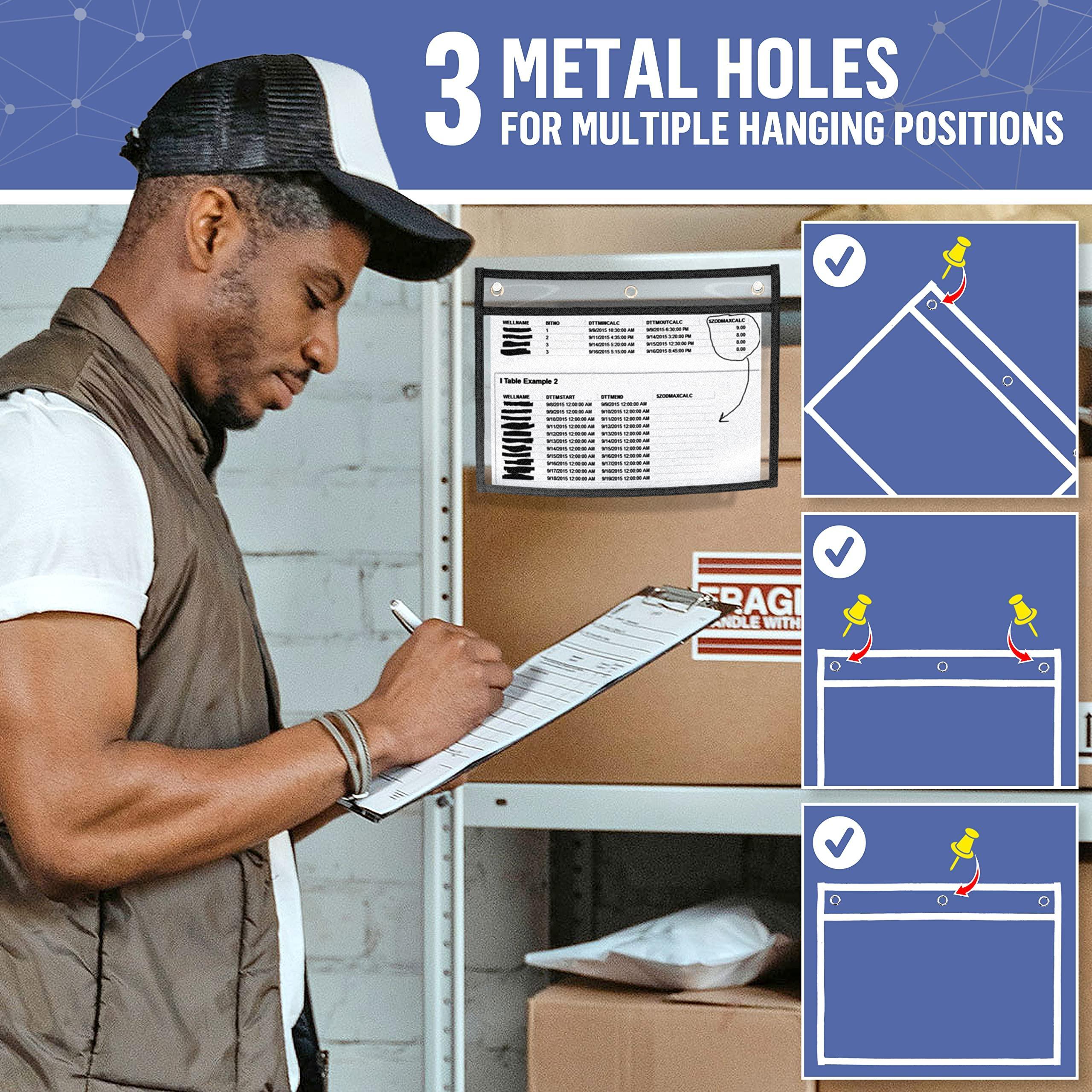 Convenient Horizontal Job Ticket Holders 8.5×11 – The inside size of dry erase pockets is 8.5 x 11 inch. Simply insert & remove up to 20 sheets. Dry erase document holder opens on long side and has 3 convenient eyelets at the top for handing.