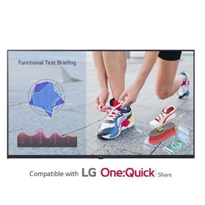 55″ UHD, 3,840 X 2,160 (UHD), 400 nit, Lifetime 30,000Hrs (Min),Operation Hours (Hours / Days) 16 / 7,Portrait / Landscape, Bezel Color Ashed Blue, VESA Standard Mount Interface300 – 300 mm, Internal Memory (eMMC) 16 GB, Built-in Wi-Fi, Sensor (Temperature Sensor, Auto Brightness Sensor), Local Key Operation (Power On/Off Only), web OS 6.0, Embedded CMS (Local Contents Scheduling, Group Manager), USB Plug & Play, Fail Over, Background Image (Booting Logo Image, No Signal Image), Sync Mode (RS-232C Sync, Local Network Sync), Screen Share, Video Tag (4, Max One HDMI Input), Play via URL, Rotation (Screen Rotation, External Input Rotation), Gapless Playback, Tile Mode Setting, Setting Data Cloning, SNMP, ISM Method, Auto Set ID, Status Mailing, Control Manager, 3rd Party Compatibility (Cisco Certi. (TBD – 23.7), Crestron Inside, Power (Smart Energy Saving, PM Mode, Wake on LAN, Network Ready), Beacon, HDMI-CEC, SI Sever Setting, webRTC, Pro:Idiom, Operation Temperature 0C to 40C (Portrait Scene : 0C to 35C),Operation Humidity 10 % to 80 %, Super Sign CMS, Super Sign Control+, Supe rSign WB,LG Connected Care, HDMI (3, HDCP 2.2/1.4), RS-232C In (4 Pin Phone-jack), RJ45 (LAN), USB 2.0 (2, Type A), Audio Out, RS-232C Out (4 Pin Phone-jack), Speaker Yes (10W x 2).