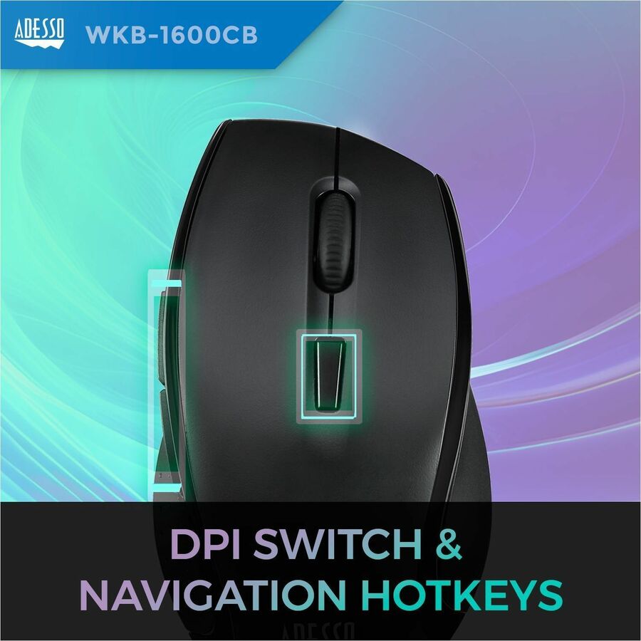 The Adesso Wireless Ergonomic Keyboard & Optical Mouse offer users two advanced input devices with ergonomic design, multifunctional features and a wireless range of up to 30 feet. The design of this keyboard with splitted key zones and gently sloped encourages natural position of hands, wrists, and forearm in maximum comfort for long use. The new chiclet keycap with its larger keycap surface makes typing easier and blends in with the keyboard to make a stylish design. The included wireless optical mouse not just provides comfortable ergonomic design but also equips with a DPI switch for changing resolution (800/1200/1600) and two Internet navigation buttons.