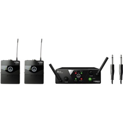 Plug & play wireless microphone system, including SR40 mini2 dual channel receiver, 2x PT40 mini pocket transmitters, 2x instrument cables, SMPS switched mode power supply (EU/US/UK/AU), 2x AA batteries