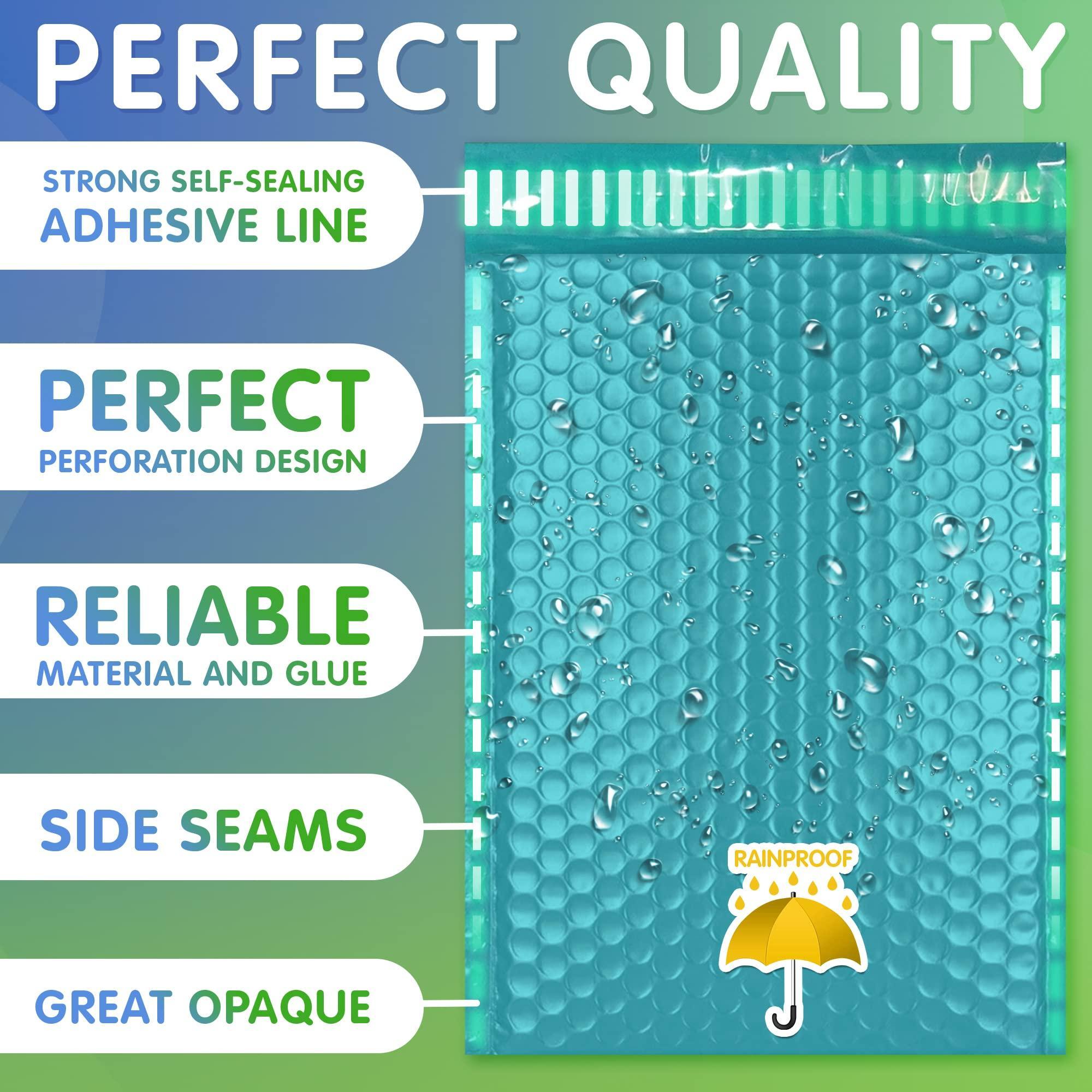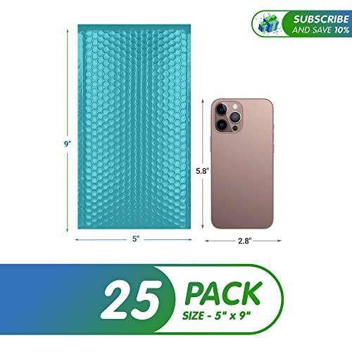 SHIP WITH CONFIDENCE. Teal waterproof bubble mailers with peel-n-seal are reliable choice for sending private items, photos, documents, etc. Shipping labels and stamps are easily attached to bubble mailer envelopes. Manufacturer size tolerance +/- 0.25″. Size: 5″ x 9″. Quantity: 25 pcs per pack.