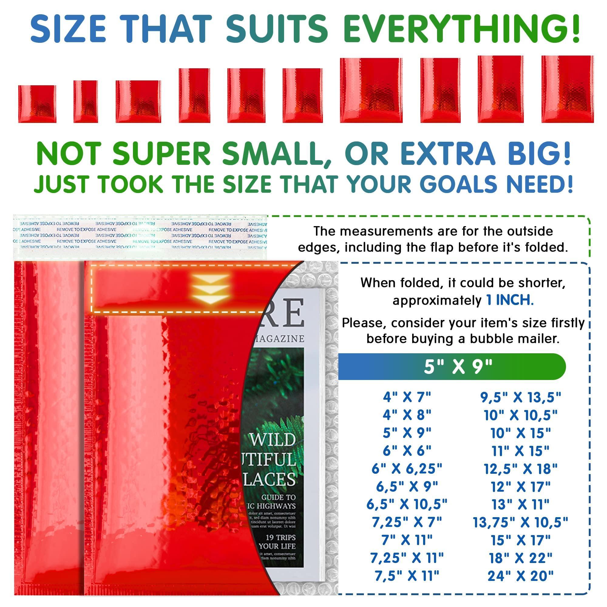 POLY BUBBLE MAILERS are made in glamour red color. Shiny and opaque red bubble mailer envelopes keep the contents private. Such red bubble mailers will surely intrigue and delight their recipients. Size: 5″ x 9″. Quantity: 25 pcs per pack.