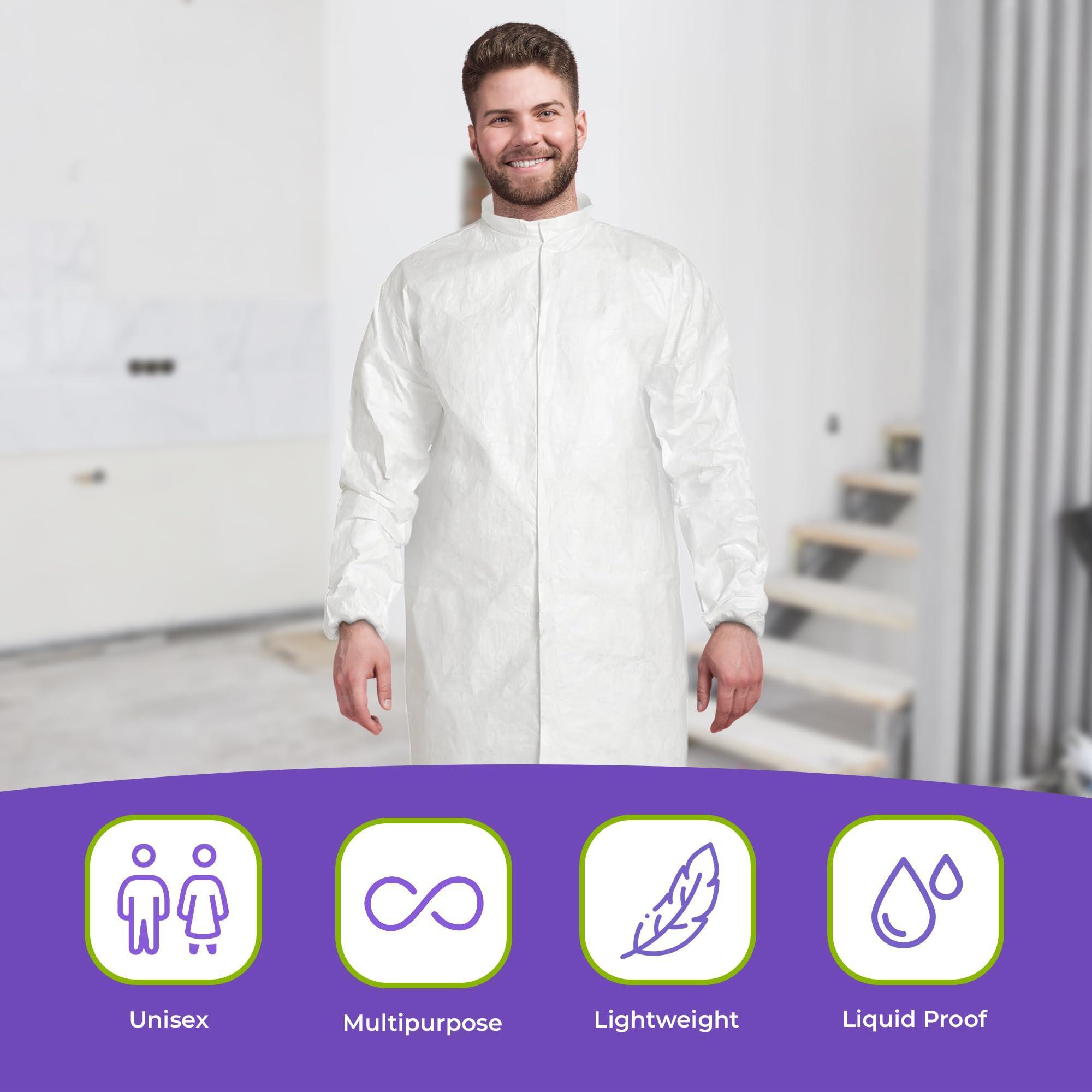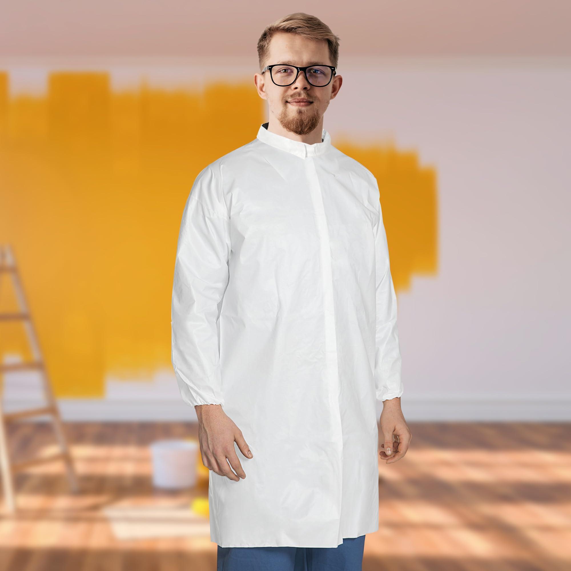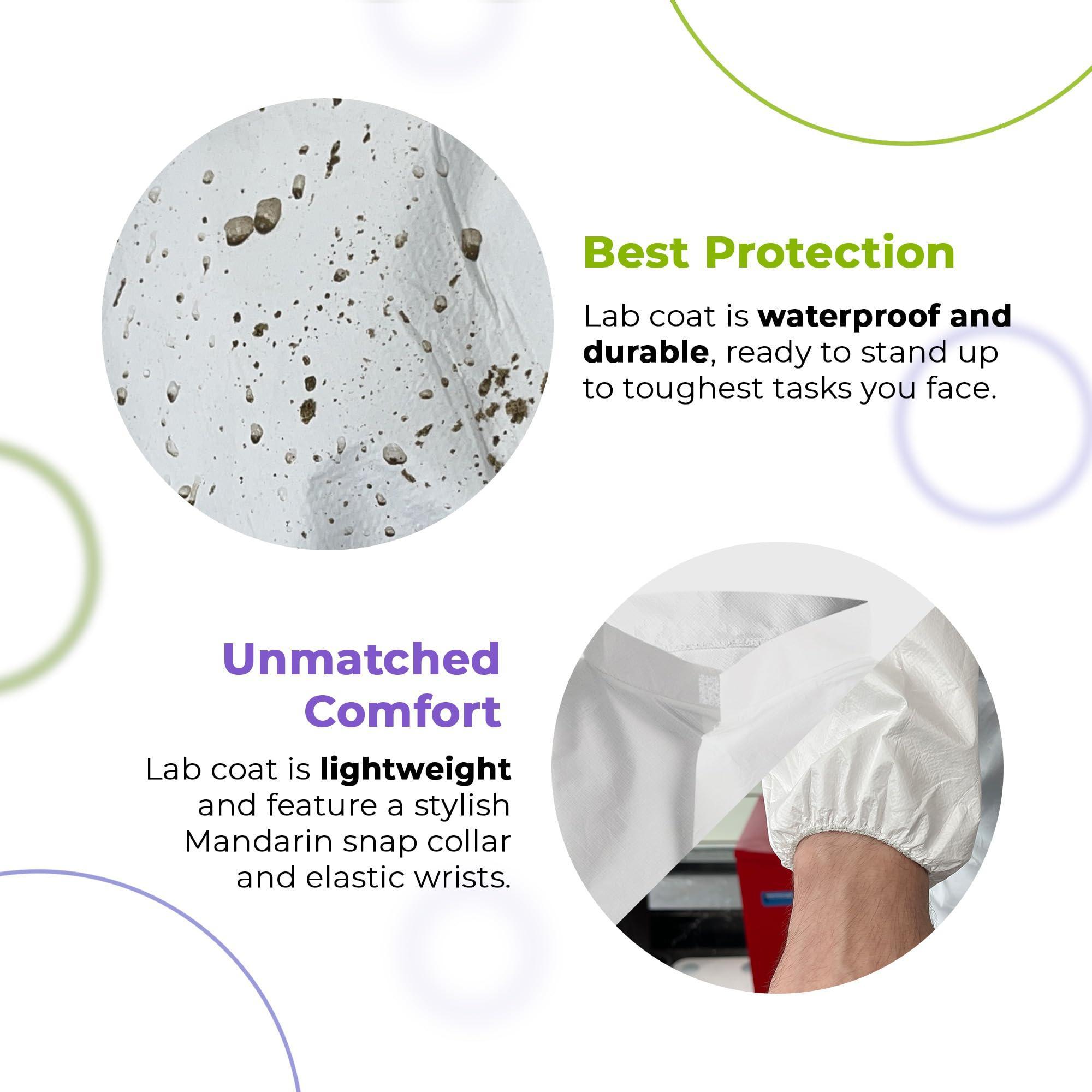 Durable Adult Lab Coat. This PPE coat is designed from durable microporous fabric. The lab coat knee length is breathable and spacious, so feel comfortable and move freely during the work.
