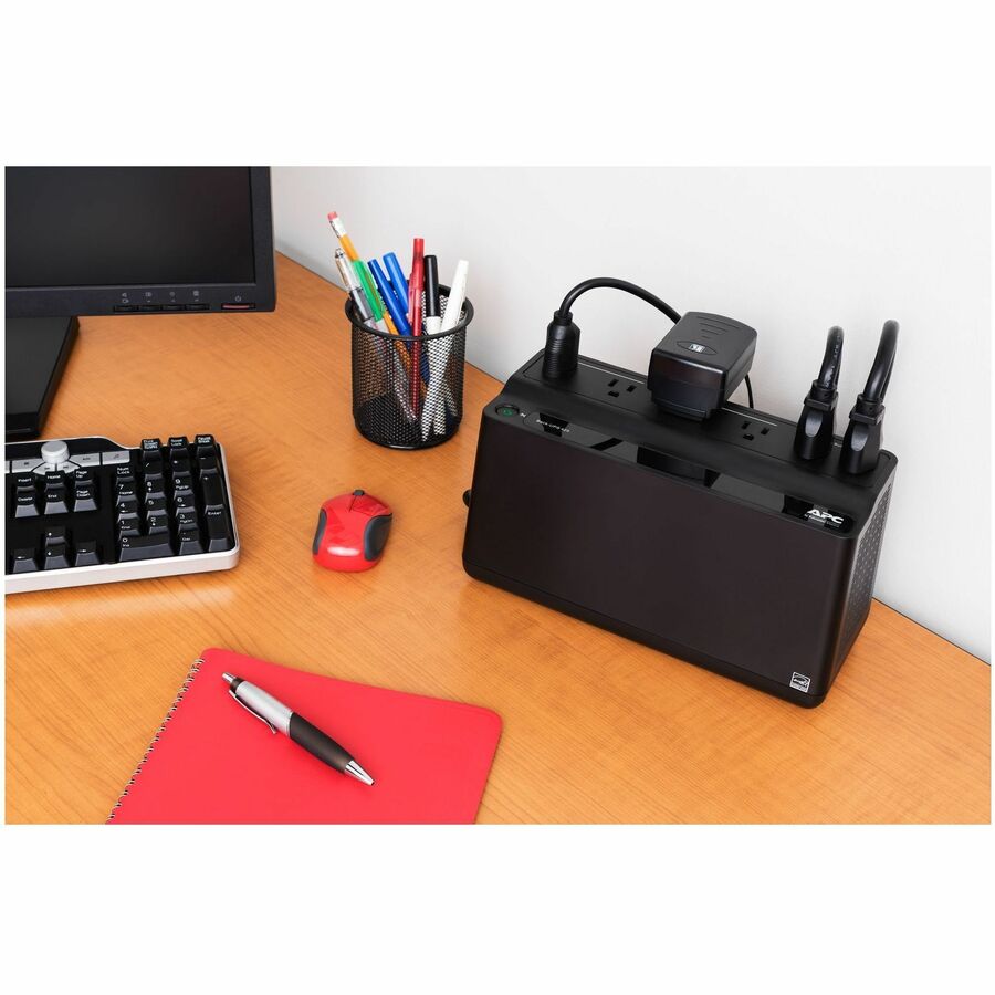 This APC Back-UPS offers power and surge protection for wireless networks, computers, gaming consoles and other electronics in your home or business. The 425VA floor/wall mount UPS has 6 total outlets, 4 of which are battery back up and surge protection, and 2 that are surge protection only. It has a surge energy rating of 180 Joules. This battery backup is designed to power wireless home networking devices (router and modem) for hours during utility outages so you can stay connected and productive. This computer backup offers lifetime guaranteed surge protection with a ,75,000 equipment protection policy. The side of this 425VA UPS includes 2 keyhole sockets to easily mount the battery backup on a wall in hard to reach installations. The outlets are arranged with spaces to accommodate both average sized power plugs and transformer block power plugs. Use the included PowerChute software to configure settings and set up automatic graceful shutdown of a connected PC in the event of an extended power outage. Audible alarms provide notification of changing utility power and UPS conditions. Audible alarms can be muted. This UPS has a 3-year warranty and CE product certification.