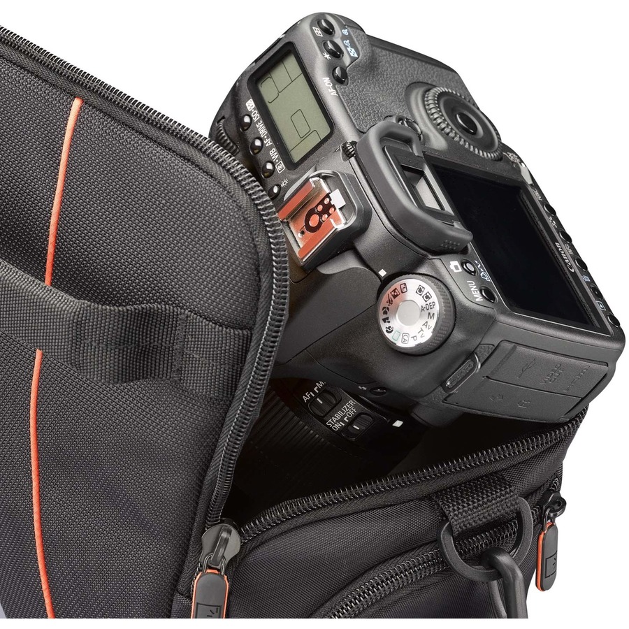 - Side zippered pockets store an extra battery, cables, lens cap, or small accessories