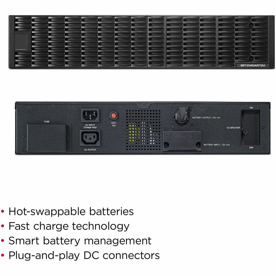 The CyberPower BP72V60ART2U rack/tower convertible Extended Battery Module (EBM) for Smart App Online UPS systems OL2200RTXL2U, O22000RTXL2UN, OL3000RTXL2U, OL3000RTXL2UN and OL3000RTXL2UHVN extends battery runtimes during power outages. This EBM takes 2U of rack space and can be installed as a tower to match the UPS form factor. It also has a built-in battery charger, providing Fast Charge Technology to quickly restore the backup power supply to full capacity.