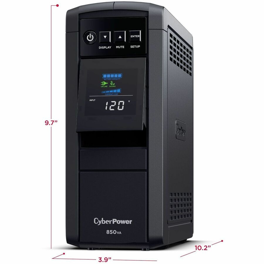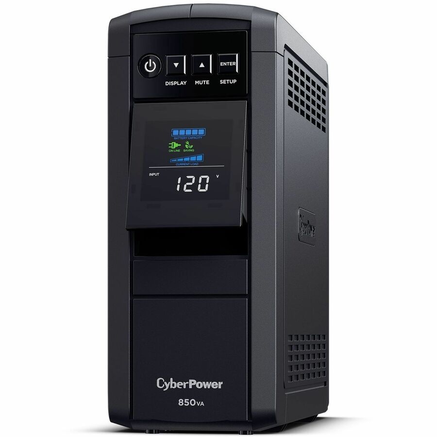 A mini-tower UPS with line interactive topology, the CyberPower PFC Sinewave CP850PFCLCD provides battery backup (using sine wave output) and surge protection for desktop computers, workstations, networking devices, and home entertainment systems requiring active PFC power source compatibility.