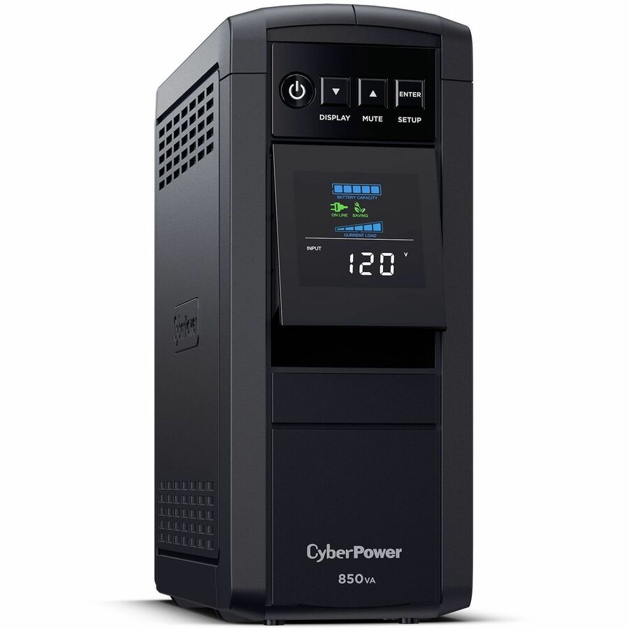 The CP850PFCLCD features an advanced multifunction control panel with a color LCD to quickly confirm status and alerts at-a-glance. The screen tilts for easy viewing when the UPS is placed in a low position such as under a desk.