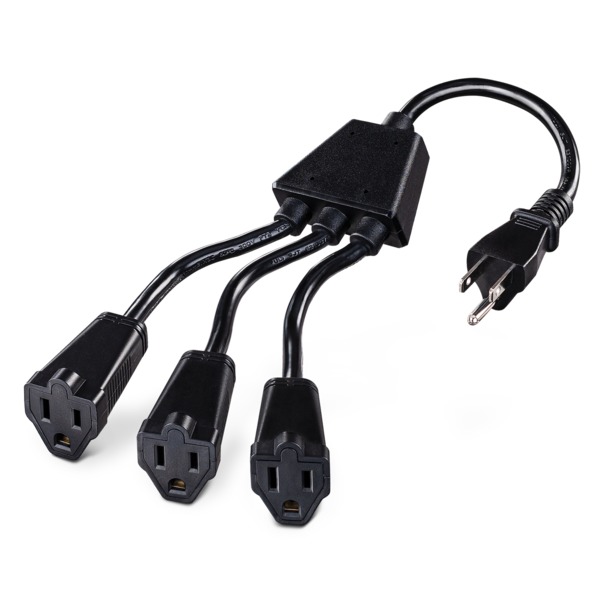 • Expands 1 outlet into 3, freeing up wall outlet to simultaneously power more electrical devices;• 13 amp power capacity, 125 volts;• Straight NEMA 5-15P plug with 3 NEMA 5-15R outlets;• Three 4 in. extenders for a total length of 13 in.;• Extenders allow use of transformer plugs and power cords of different lengths;• 16-gauge power cable is highly flexible but thick, durable, and built to last;• 1-year warranty ;• ETL(R) certified for safety;• Dimensions: 4 in. W x 1.5 in. H x 13.32 in. L;• Includes user manual;• Black;