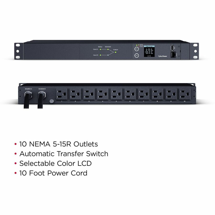 The PDU24001 supports inputs between 100-120V and includes (10) NEMA 5-15R outlets. Dual NEMA 5-15P power cords are plugged into separate power sources (A and B), and information about each power source is provided via LED indicator lights on the front of the unit. Other features include an LCD with selectable background color, ugradeable firmware, and network-grade plugs and outlets. The CyberPower PDU24001 is protected by a three-year limited warranty.