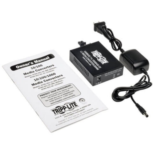 Tripp Lite’s N785-001-LC-MM 10/100/1000 to Multimode Media Converter ( RJ45 to LC ) is an economical way to extend the distance of network nodes up to 550M by converting Cat5e UTP cables to Multimode Fiber Optic. The Media Converter features automatic MDI/MDI-X configuration, and the UTP port senses the network speed automatically. Auto-detects half or full duplex operation on the fiber port. Power supplied by small form factor AC adapter.