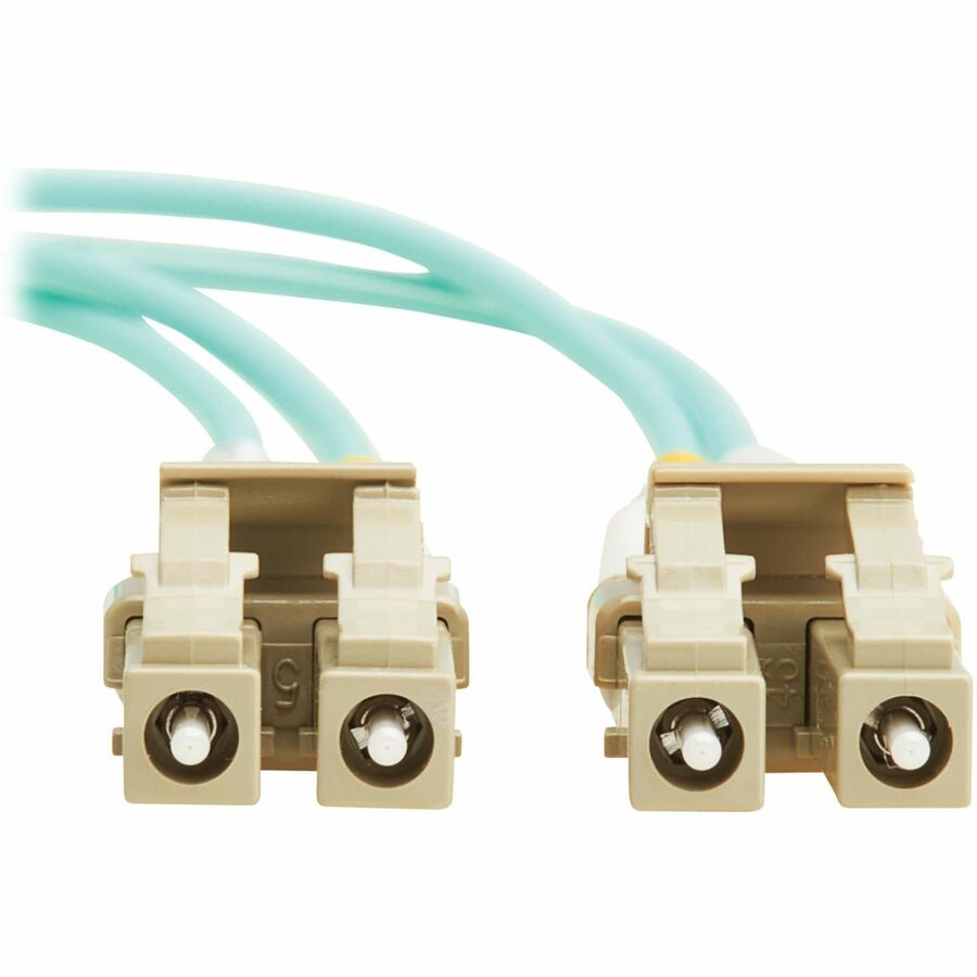 Premium materials ensure this multimode fiber cable reliably carries data and voice signals. The N820-03M-OM4TAA has duplex male LC connectors on each end and features a low-smoke zero-halogen (LSZH) jacket that limits the amount of toxic smoke emitted in case of combustion, making it suitable for poorly ventilated areas. The aqua color of the jacket identifies the cable as OM4 rated. It meets current IEEE 802.3ae and TIA LOMMF standards, and is compatible with existing OM3- and OM4-rated 50/125 fiber solutions..