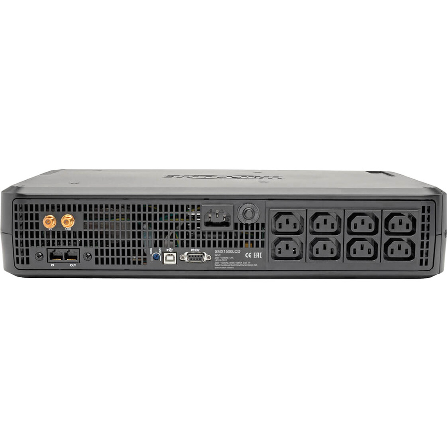 Featuring eight IEC-320-C13 outlets and a C14 inlet that accepts a user-supplied AC power cord, the SMX1500LCD has a user-replaceable internal battery that provides 12 minutes of support at half load and 4.5 minutes at full load. It can also power an entry-level PC up to 60 minutes or a single DVR/VCR component up to three hours. A front-panel LCD screen lets you monitor operating data, such as voltage, battery and overload statuses.
