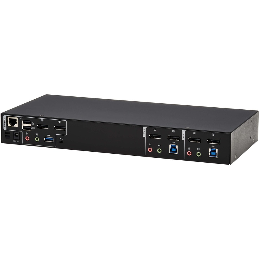 The B006-DP2UA2 supports video resolutions up to 4K UHD (3840 x 2160 @ 60 Hz) and 4K DCI (4096 x 2160 @ 60 Hz) on two DisplayPort monitors, as well as 2.1-channel surround sound for music, movies and games. Independent audio switching lets you listen to music or a podcast on one computer, while simultaneously working on a second computer. Front-panel audio jacks have priority over the rear-panel jacks. A DCC (Daisy Chain Control) port lets you connect two B006-DP2UA2 KVM switches for a quad-display installation.