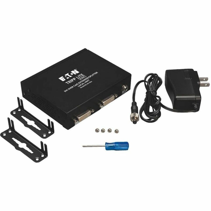 The B140-004 transmits a DVI-D Single-Link signal to four monitors up to 200 ft. away using a single Cat5e/6 patch cable. To achieve maximum distance and resolution, use 24AWG Solid Wire Cat5e/6 cable (Tripp Lite’s N202-Series). An additional DVI port is provided for the connection of a local monitor. This local DVI port can also be used to daisychain up to 3 units together, allowing for the connection of up to 13 monitors (12 remote, 1 local). Mounting hardware is included that allows the unit to be rackmounted, wallmounted or pole mounted. In addition, up to three units can be mounted in 1U of rack space using a Tripp Lite B132-004-RB 19″ rackmount bracket. The B140-002 is compatible with all operating systems, and is plug and play, with no software or drivers required.