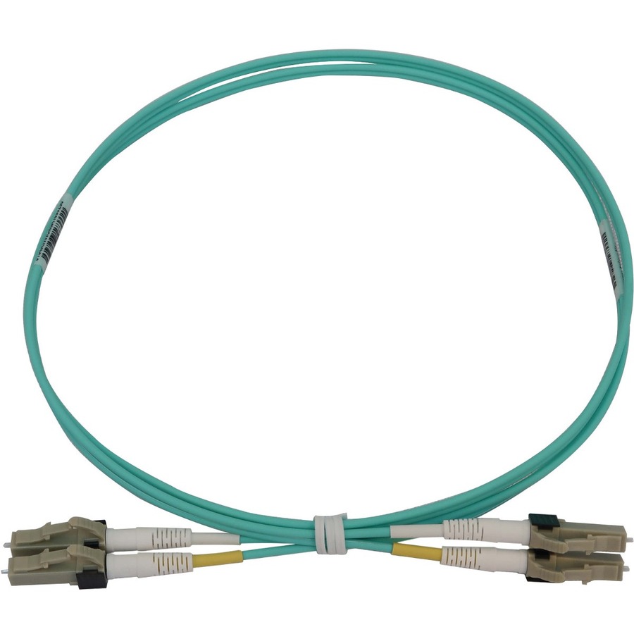 The OM3-rated cable has an aqua jacket to identify it as multimode in a crowded patch panel or switch and prevent it from becoming accidentally disconnected. The round low-smoke zero-halogen (LSZH) jacket limits the amount of toxic smoke emitted in case of combustion, making it suitable for poorly ventilated areas.