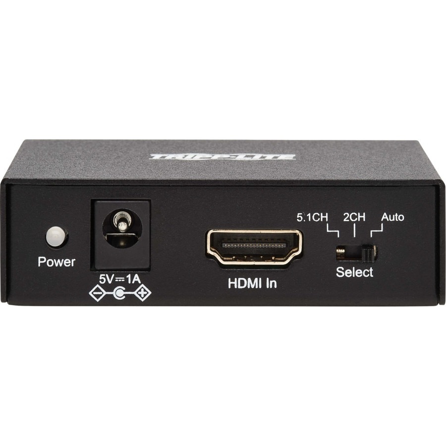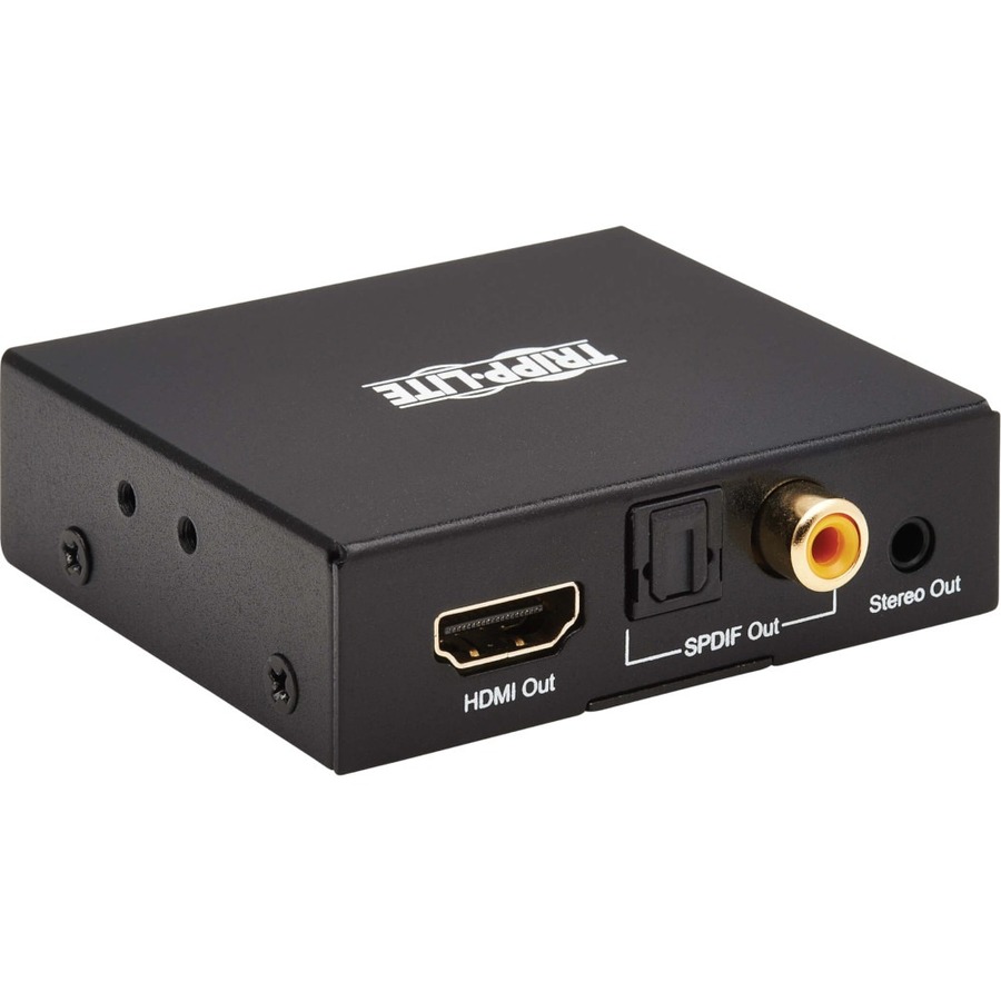 The P130-000-AUDIO2 features 3.5 mm stereo analog, TOSLINK digital optical and RCA digital coaxial audio outputs to match most non-HDMI receivers and audio systems. It supports 2-channel stereo and multi-channel audio up to 5.1 surround sound, as well as uncompressed audio, such as LPCM, and compressed audio formats, including DTS and Dolby Digital. An LED indicates when the unit is receiving power or transmitting an A/V signal.