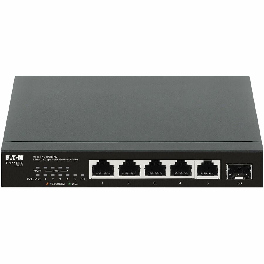 The NG5POE-M2 features five twisted-pair RJ45 Gigabit Ethernet ports that support auto-negotiable 2.5 Gbps and auto MDI/MDIX functionality, so crossover cables and uplink ports are not needed for connections to PCs, routers and other switches. No configuration is required, so you can have your Gigabit network up and running immediately. IEEE 802.3x flow control (full duplex), back pressure (half duplex) and 45 Gbps switching capacity allow smooth transmission of large files. One 10 Gbps SFP+ port is included for uplinking data to other switches using optical fiber cabling.