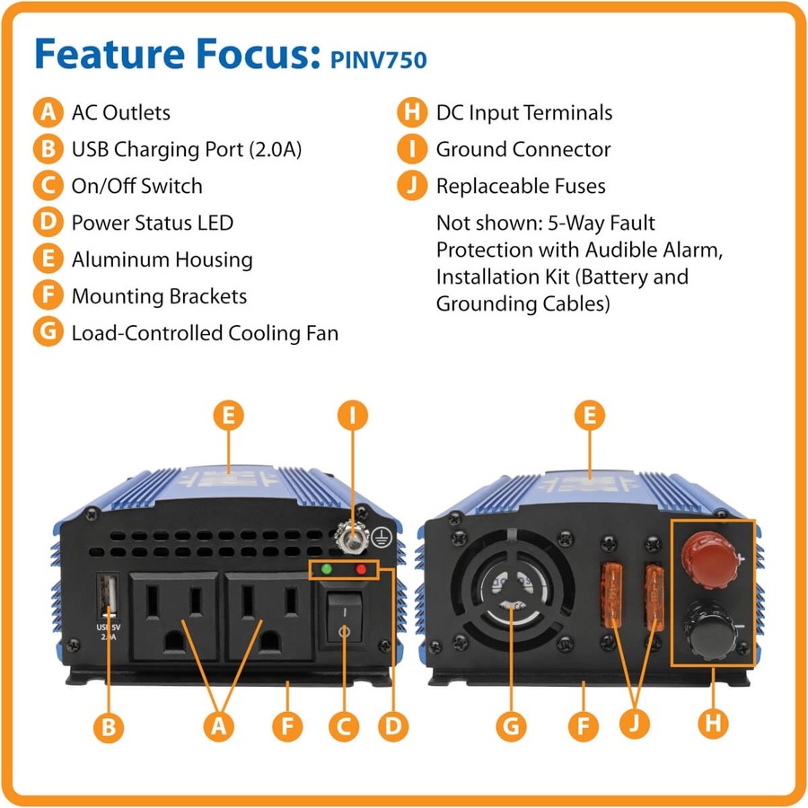 Eaton Tripp Lite Series 750W Light-Duty Compact Power Inverter with 2 AC/1 USB – 2.0A/Battery Cables, Mobile – Input Voltage: 12 V DC – Output Voltage: 120 V AC