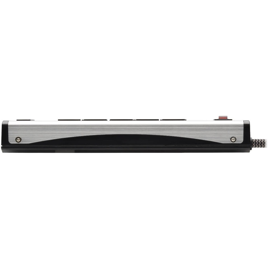 This surge protector with 8-foot braided AC input cord and NEMA 5-15P plug gives you flexibility in placing the unit away from the nearest wall outlet. Keyhole slots incorporated into the bottom panel provide convenient wall or desk mounting options for the black metal housing.