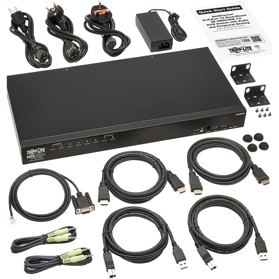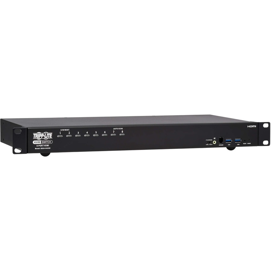 The B024-H4U08 supports Ultra HD video resolutions up to 4096 x 2160 at 60 Hz with 2.1-channel surround sound audio. With independent audio switching, you can listen to music or other audio from one computer while working on a different computer. The front-panel audio jack has priority over the rear-panel jacks.