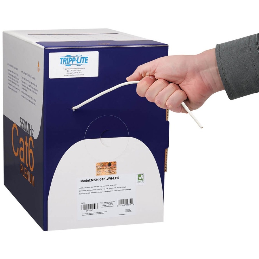 This high-speed bulk cable is ideal for Cat6 premise (in-wall) applications in air ducts and drop ceilings in commercial and residential installations. This includes the distribution of data, voice, security and audio/video across Gigabit Ethernet networks. Designed for fast transmission and excellent signal quality, this 1000-foot roll of white cabling ensures peak performance through your LAN. Manufactured from 23 AWG copper wire, the N224-01K-WH-LP5 delivers speeds up to 550 MHz/1 Gbps.