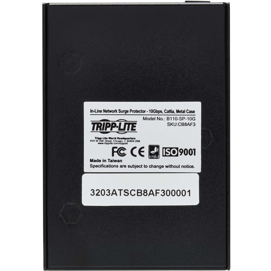 Ideal for home/corporate security systems, home theaters, trade shows and other digital signage applications, the B110-SP-10G protects connected network equipment from damage caused by electrostatic discharge (ESD), power surges and cable discharge events. Just connect it between your network source and device using Cat5/5e/6/6a/8 cables and ground it with the included wire.