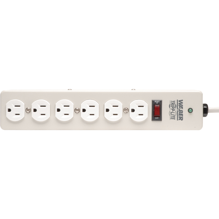 The Waber-by-Tripp Lite DG206 Power Strip offers a convenient method of power distribution and surge suppression in workbench, wallmount or floor mount applications. Includes 6 NEMA 5-15R output receptacles, 6 foot AC line cord and keyhole mounting tabs for installation in a wide variety of applications. Protects connected equipment from transient surges and line noise with built in surge suppression rated at 1050 joules. Corded, multi-outlet strip reduces cabling clutter and enables the connection of multiple electrical devices to a single AC wall socket. Features metal housing, lighted power switch with integrated 15 amp resettable circuit breaker and attractive gray color scheme. Lifetime warranty.PLUG/OUTLETS – Input: NEMA 5-15P/Output: 6 NEMA 5-15RELECTRICAL – 120VAC, 50/60Hz, 15A (Requires standard NEMA 5-15R wall receptacle)FORMAT – Corded metal power distribution strip with lighted power switchSUPPRESSION – 1050 joules AC suppression