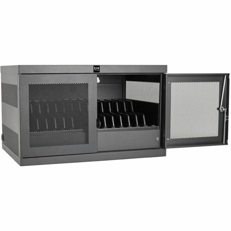 - Locking steel cabinet provides AC charging, secure storage and cord management for up to 16 Chromebooks and laptops