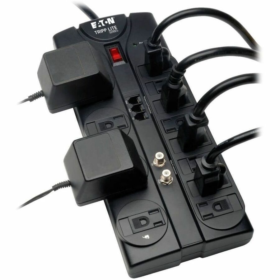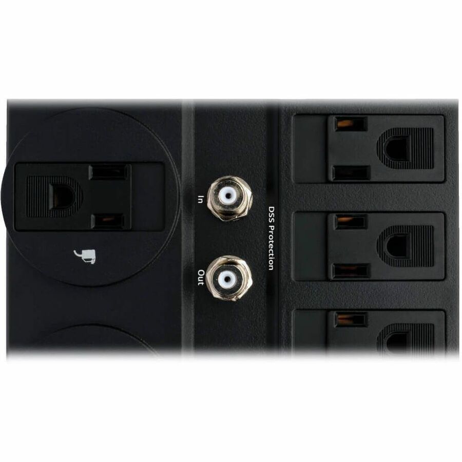 Surge suppressor offers economical AC surge suppression for protection of workstations, PCs, telecom systems, home electronics and more. Cord features a space-saving, right-angle plug for convenient use. RJ11 jacks prevent surges from damaging your modem, fax and phone equipment. Suppressor accommodates up to four transformers without blocking the remaining outlets. Digital, 2.2GHz coax jacks prevent surges from damaging your cable or satellite equipment.