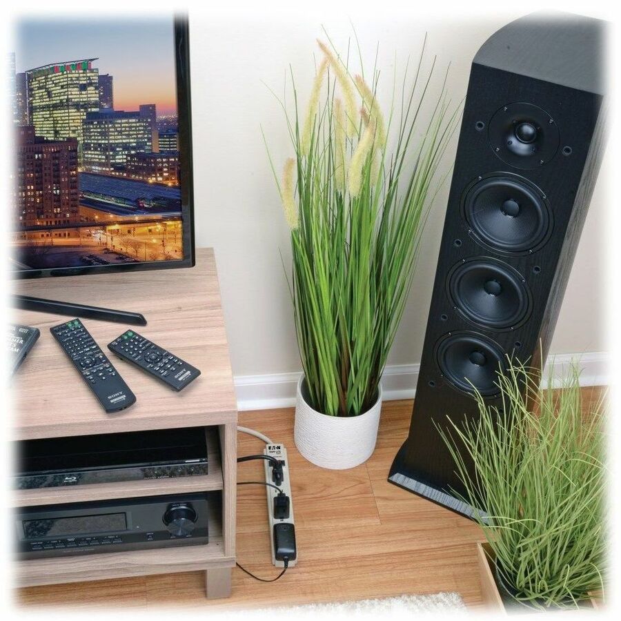 Surge protector provides economical AC surge suppression for workstations, desktop PCs, telecom systems and other sensitive electronics. Built-in AC surge suppression shields connected equipment from damage and performance problems due to transient surges. TLP604 offers six total outlets, 15 amp resettable circuit breaker and a 6′ cord. AC suppression rated at 790 joules shields equipment from surges and line noise. It includes full normal mode (H-N) and common mode (N-G/H-G) line surge suppression. Attractive gray housing with keyhole mounting tabs and one designated transformer plug outlet offers convenient protection of desktop computer equipment and accessories.