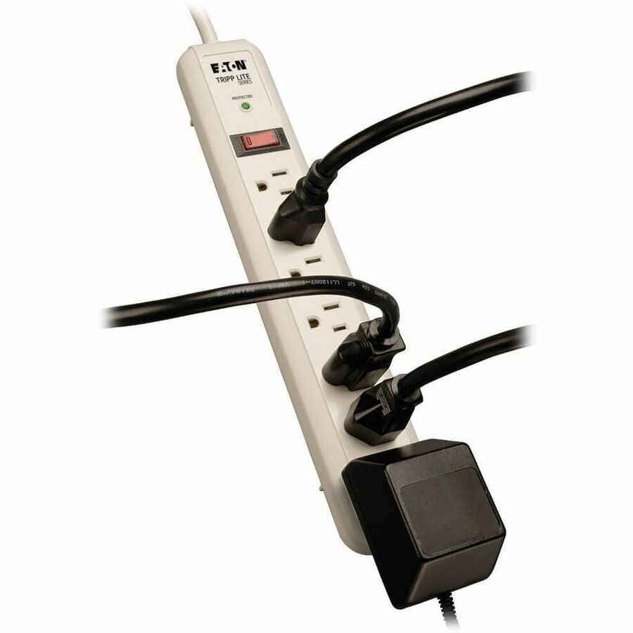Tripp Lite’s TLP74R offers economical AC surge suppression for protection of workstations, desktop PCs, telecom systems and other sensitive electronics. Built-in AC surge suppression shields connected equipment from damage and performance problems due to transient surges. TLP74R offers 7 total outlets (6 at right angle and 1 designated transformer plug outlet), 4 foot cord and diagnostic LED to warn of suppressor damage. AC suppression rated at 1080 joules shields equipment from surges and line noise. Attractive gray housing with keyhole mounting tabs offering convenient protection of desktop computer equipment and accessories.
