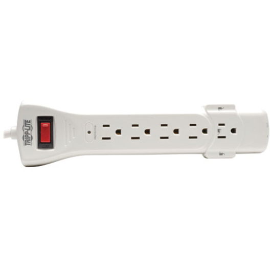 Surge protector with seven outlets accommodates bulky transformers without blocking remaining outlets. EMI/RFI line noise filtering. LEDs warn of potential power problems. Surge protection up to 1270 joules. Includes a 6′ cord.