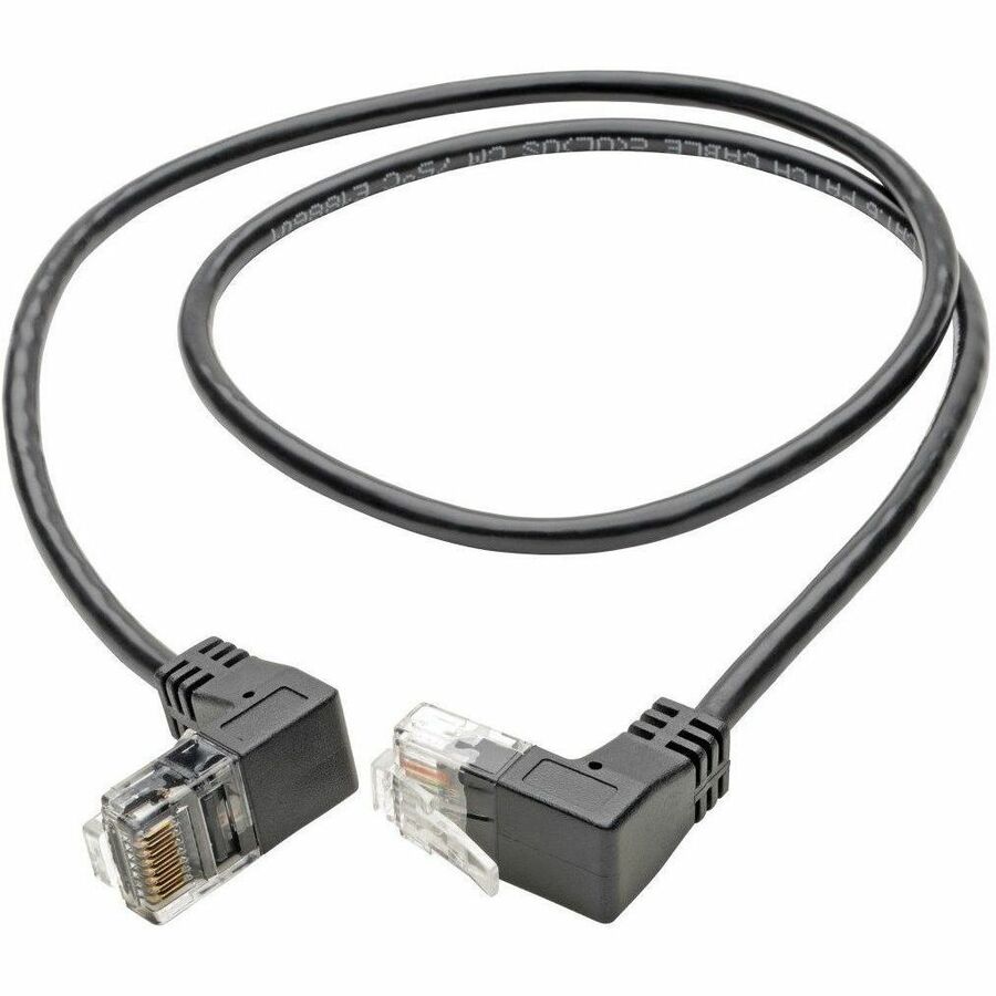 This right-angle Cat6 patch cable features a black PVC jacket and molded black ends. The color-coding allows easy, fast identification in a crowded rack or workstation and helps prevent the cable from becoming inadvertently disconnected.