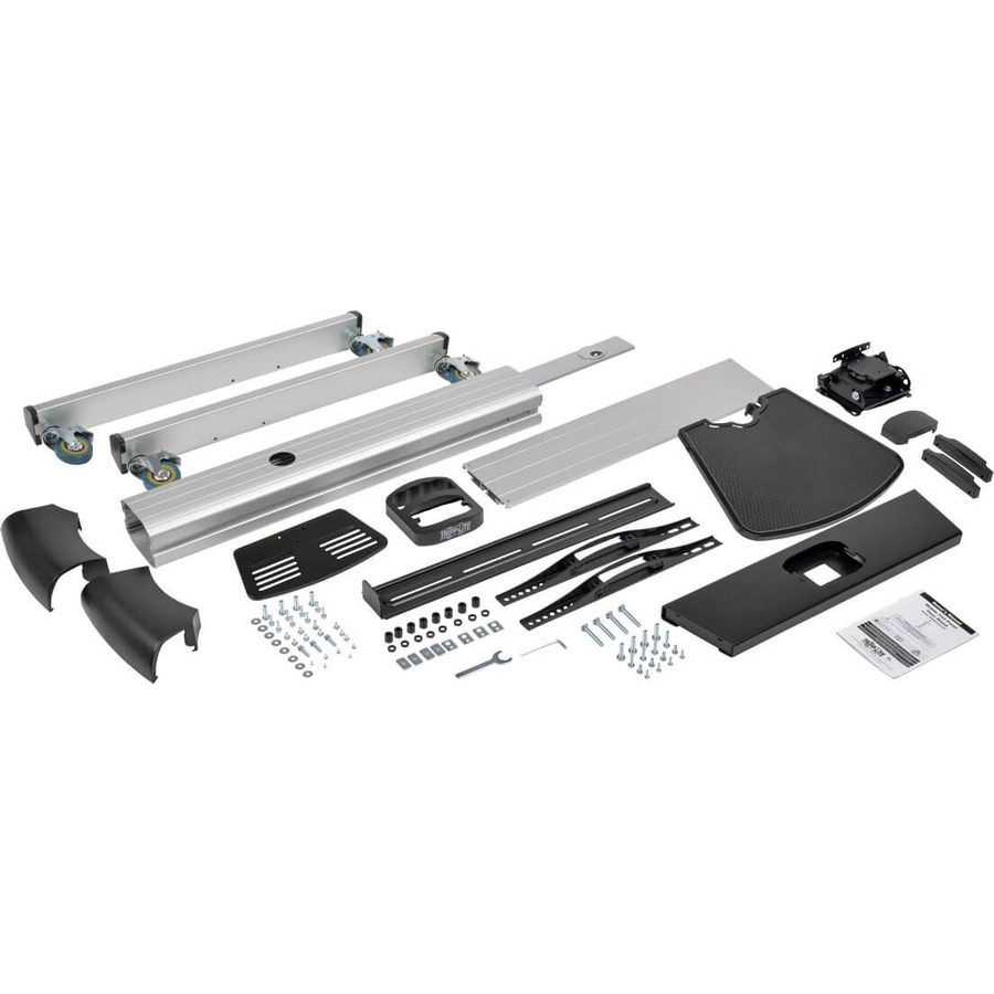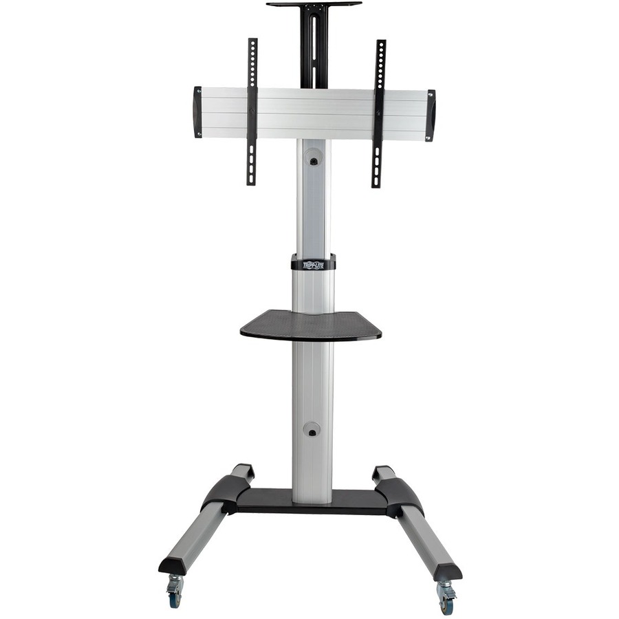 A shelf mounted above the display holds projectors, webcams and laptops. A lower shelf holds other audio/video components, such as a Blu-ray player. Durable aluminum and steel construction supports up to 150 lb. The adapter brackets can be adjusted to conform to VESA-compliant displays with any of the following mounting hole patterns: 200 x 200, 300 x 300, 400 x 200, 400 x 400 and 600 x 400.