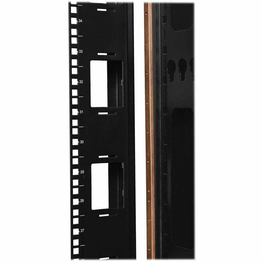 The SRGROUND is a full length (42U) bus grounding bar made from heavy-gauge solid copper that attaches to Rack Enclosure Cabinets or Open Frame Racks to provide convenient ground contact for standard rackmount equipment. Every U space has a drilled and tapped hole to allow a ground wire “jumper” to be installed. The jumper then bridges to the individual pieces of equipment, allowing a direct path to ground rather than going through surrounding equipment. The SRGROUND can mount in a Tripp Lite enclosure in two ways, it can be screwed into the Rack Enclosures (hardware included) or it can be installed using the tool less mounting buttons in the Open Frame Racks.