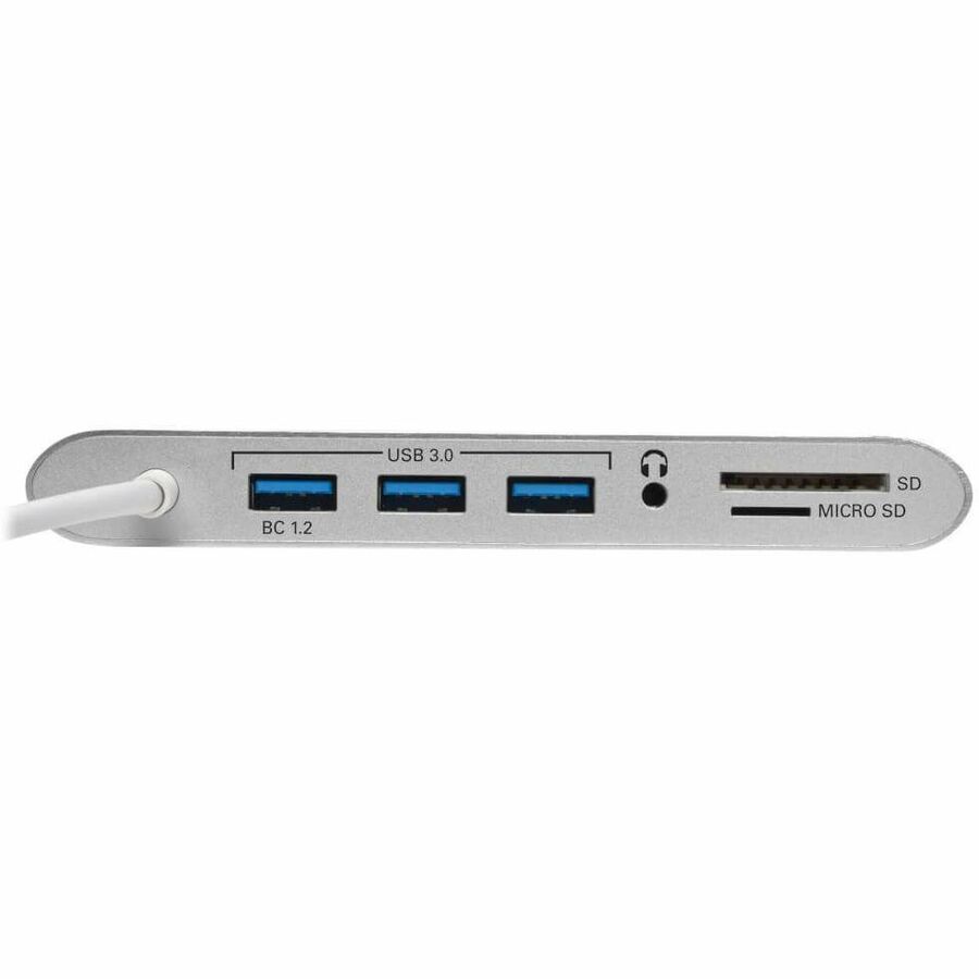 USB 3.1, generation 1 USB-C Docking Station turns your MacBook, Chromebook, tablet or laptop into a versatile workstation. By connecting its built-in cable to your device’s USB-C or Thunderbolt 3 port, you’ll be able to add an external display, access Gigabit Ethernet networks, transfer data, display video and more. Mini DisplayPort (mDP), VGA and HDMI ports allow you to connect an external display (one display at a time). The mDP and HDMI ports support UHD video resolutions up to 3840 x 2160 (4K x 2K) at 30 Hz. The VGA port supports HD video resolutions up to 1920 x 1200, including 1080p, at 60 Hz. Connect a Gigabit Ethernet cable (sold separately) to the RJ45 port to access true 10/100/1000 Mbps network speeds. A dedicated BC 1.2-compliant USB port provides up to 1.5A of fast-charging power. Micro SD and SD/MMC memory card slots provide access to external memory. A 3.5 mm audio jack is convenient for connecting speakers, headphones or a microphone to your connected device.