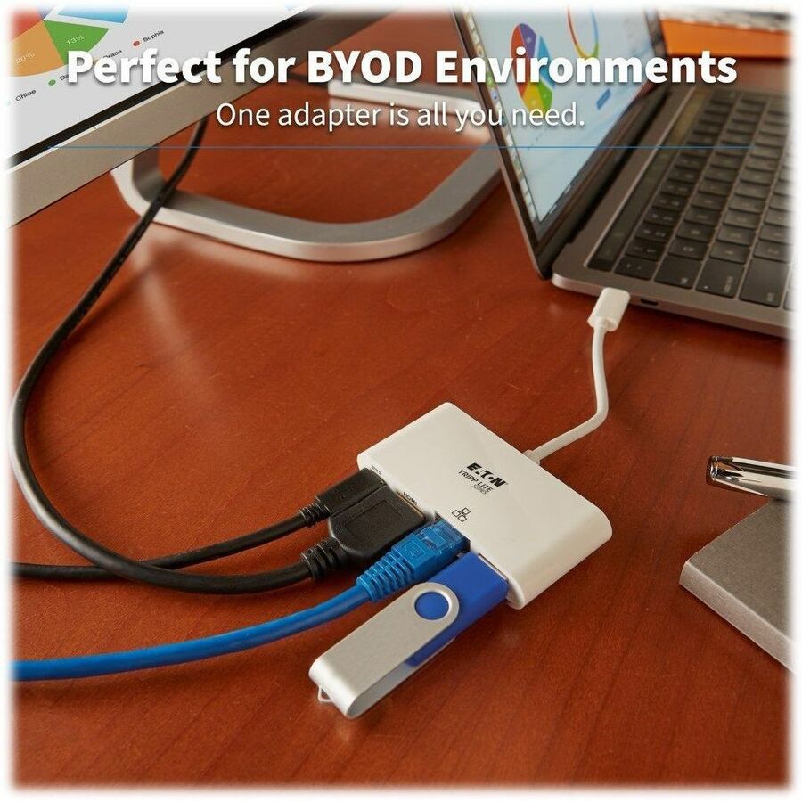 USB 3.1, generation 1 USB-C to HDMI 4K adapter expands the potential of your tablet, laptop, Chromebook, MacBook, smartphone or PC’s USB-C or Thunderbolt 3 port. Plug-and-play technology makes installation quick and simple – with no software or drivers to install. Fumble-free, reversible USB-C plug connects in either direction for a quick connection every time. To send digital audio and HD video to an HDMI TV, projector or monitor, connect the HDMI port to the display using an HDMI cable (sold separately). The HDMI port supports UHD video resolutions up to 3840 x 2160 (4K x 2K) at 30 Hz. Adapter is perfect for transmitting digital audio and 4K video to a large display, adding a thumb drive or other USB peripheral, powering and charging a PD Charging-compliant mobile device, and connecting to a Gigabit Ethernet network all at the same time.