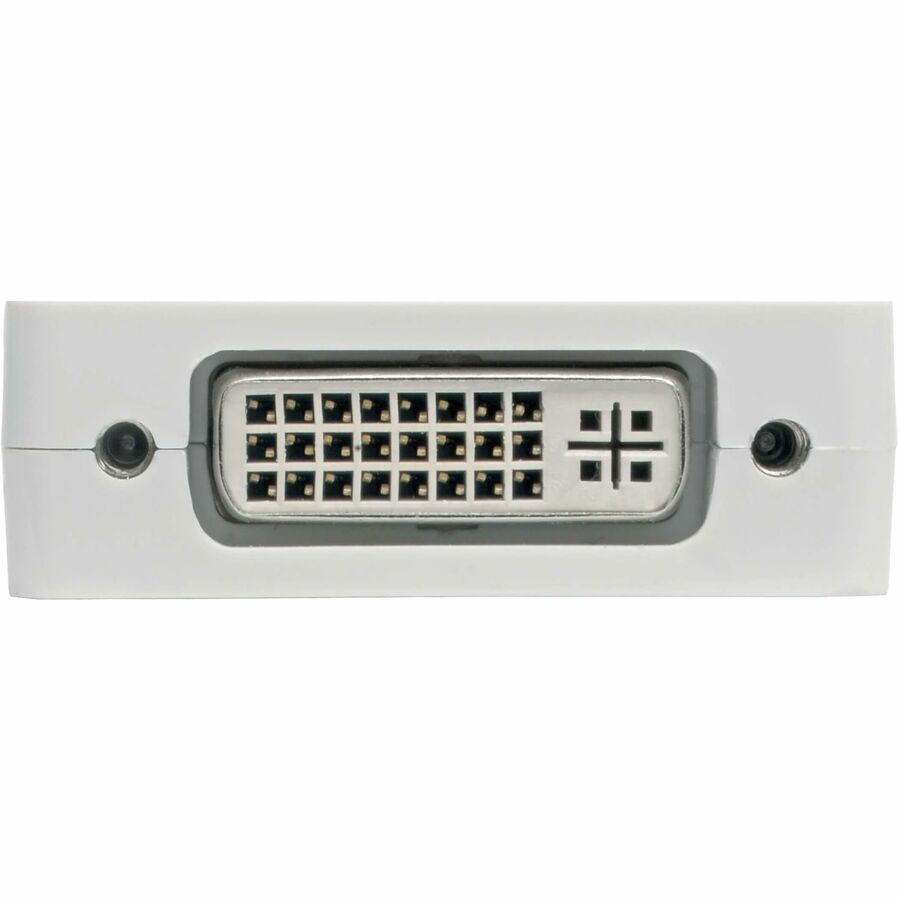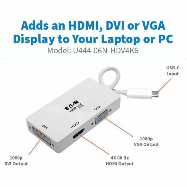 No more carrying around separate adapters to match various monitors, projectors and televisions. This USB-C adapter connects your MacBook, Chromebook, Windows laptop, PC, tablet or smartphone to a DVI, VGA or 4K HDMI display. The simple all-in-one solution for displaying video content on a larger screen, the U444-06N-HDV4K6 is ideal for giving video presentations in conference rooms and classrooms, editing multiple documents on a larger screen or streaming video for digital signage at trade shows.