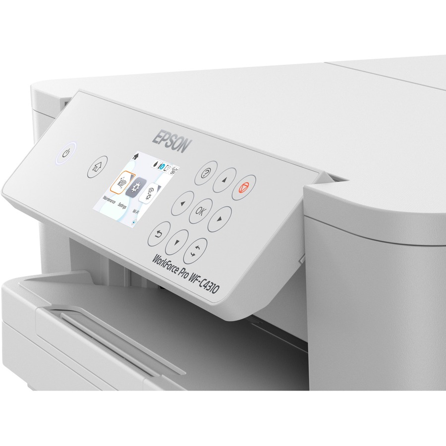 Streamline your businesses workflow and increase efficiency with this WorkForce Pro WF-C4310 Color Printer. Reliable design provides exceptional productivity with an impressive, monthly page volume up to 1,600 pages and print speeds up to 21 ppm (black) and 11 ppm (color). Print legal-size documents and borderless, letter-size photos in resolutions up to 4800 x 2400 dpi. Input tray holds up to 250 sheets for optimal use. PrecisionCore Heat-Free Technology uses lower power consumption. Compact construction is ideal for any setting. Vivid, DURABrite Ultra Inks deliver professional-quality prints. Connect using built-in wireless, Wi-Fi Direct, Ethernet or Bluetooth to print from your mobile device. Wireless connectivity supports innovative, WPA3 wireless security. 2.4″ color LCD easily navigates and controls options.