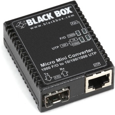 Bring fiber to the desktop and other tight spaces. The Micro Mini Media Converter is ideal for bringing fiber to desktop and mobile applications where lightweight compact size and low power requirements are critical. Weighing only 2.5 ounces and about the length of a house key this ultra-compact media converter is portable yet powerful.For extra versatility it can be USB-powered making it easy to provide fiber connectivity to locations where AC or DC power is unavailable for instance field-deployed fiber-to-the-laptop. For easy portability this tiny converter conveniently slips into a pocket or laptop carrying case.The converter is plug-and-play with an RJ-45 port that auto negotiates for speed duplex mode and crossover functions for PCs with 10BASE-T 100BASE-TX and 1000BASE-T Ethernet. On the fiber side the converter accepts SFPs for connection to a variety of Gigabit Ethernet fiber types. Use it with Black Box 1250-Mbps SFPs (LFP411 LFP412 LFP413 LFP414) or any other standard 1250-Mbps SFP. Because it can be powered through a computer’s USB 1.0 or 2.0 port the Micro Mini Media Converter is ideal for connections to fiber in areas where a spare power outlet may not be available. When plugged into a computer’s USB port the media converter shuts down automatically when you turn off the computer which saves energy.