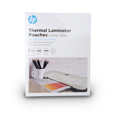 HP 200 Letter-Sized Pouch Laminator Sheets The HP Thermal Laminator Pouches works with all thermal laminators including HP laminators. These sheets are great for laminating those important documents, photos, keepsakes, menus and more. The glossy finish provides a clear and professional look to your project. For Letter Size or smaller documents Each sheet is 3mil thick Glossy Finish