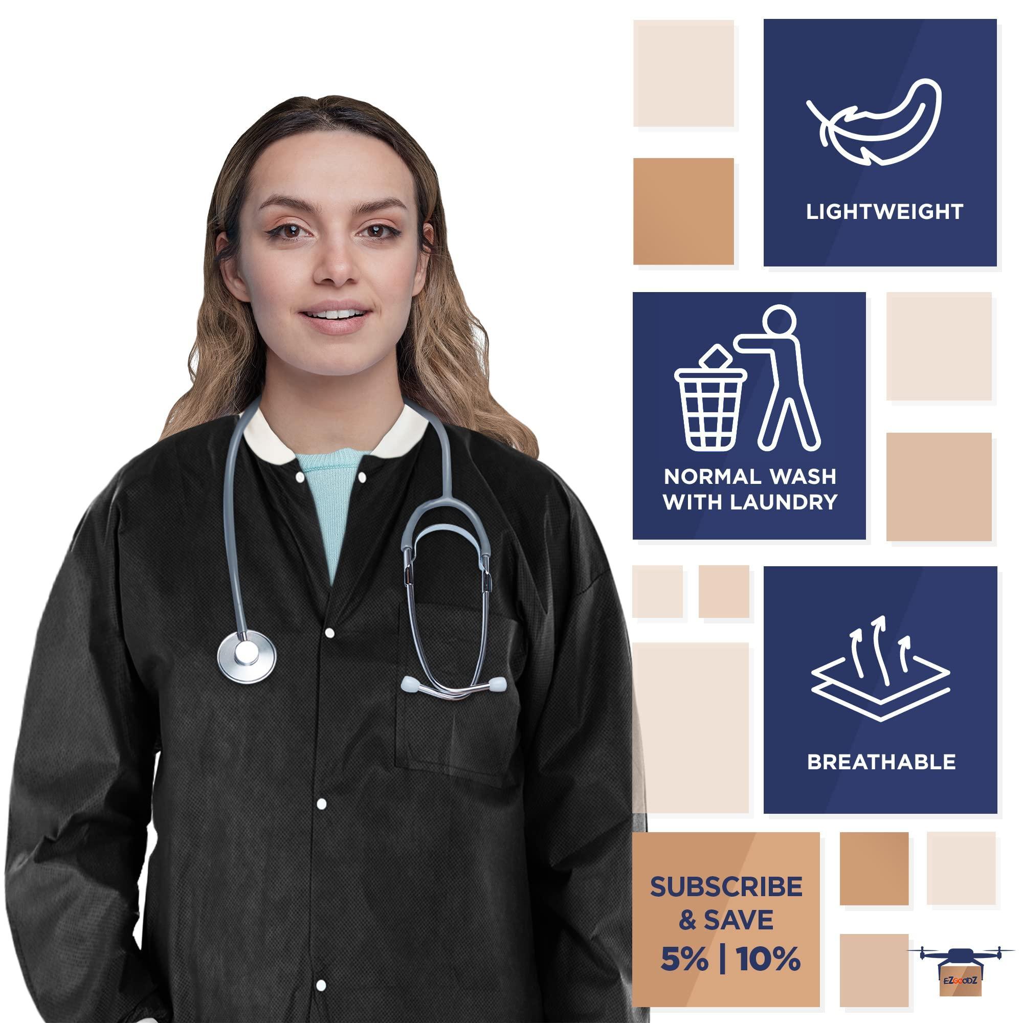 PACK OF 10 DISPOSABLE LAB JACKETS FOR ADULTS: Large black disposable jackets are 31 inches long. Unisex safety jackets provide maximum comfort and excellent protection for the body and clothing during work.