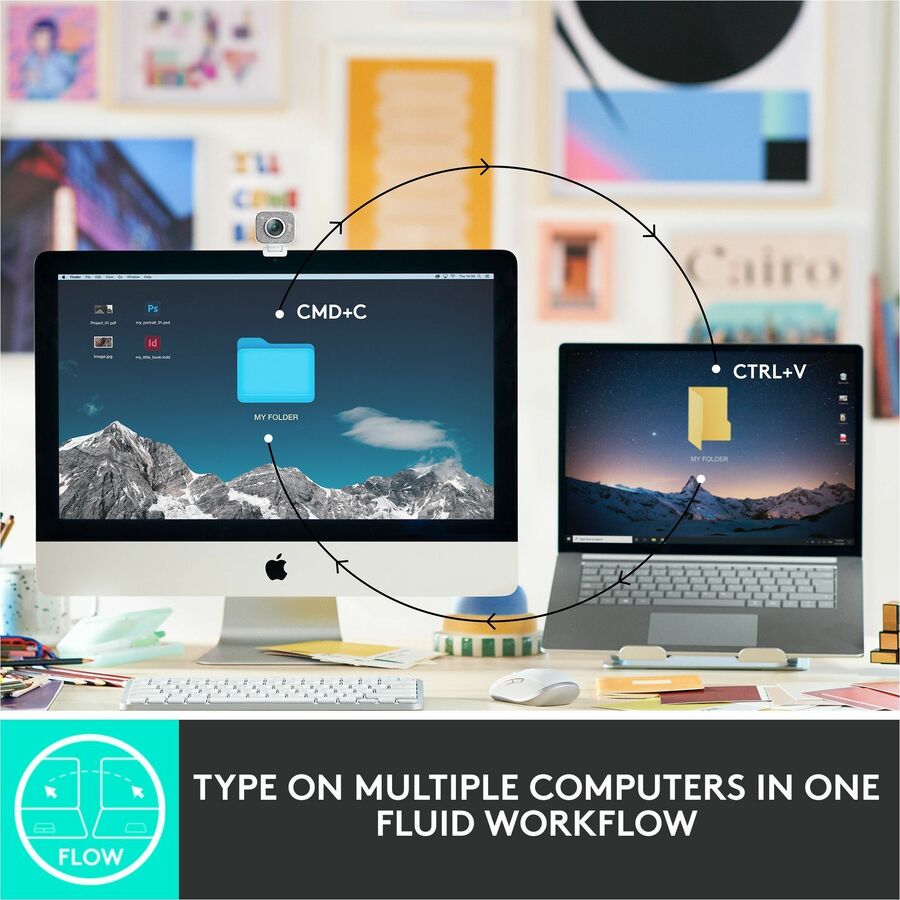 Team up with a Flow-enabled MX Master 3 or MX Anywhere 3 and type on multiple devices in one fluid workflow(1). Transfer files, documents, and images across computers and Mac and Windows operating systems(2).