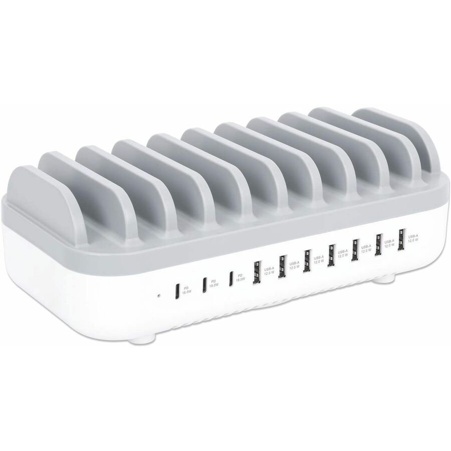 This charging station is ultra-powerful with 10 ports pumping out a total of 120 watts of power, which means simultaneous higher-powered multi-device charging. An adaptive smart chip detects and delivers the optimal charging current for connected devices. Three USB-C Power Delivery (PD 3.0) ports deliver up to 18 W per port so newer iPhones®, iPads®, Samsung® Galaxy Tabs and other PD devices can have full batteries in a short amount of time. The other seven USB-A ports fast-charge devices with power up to 12 W / 2.4 A per port. All ports feature smart, built-in safety measures to prevent short-circuits, over-voltage, over-current and overheating.