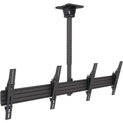 Designed for commercial applications where wall space is limited, the MB Series telescoping ceiling mount system offers a flexible solution for displaying menu boards and other digital signage. Its modular rails allow two to four screens to be placed adjacent to one another in portrait or landscape orientation, while precision leveling screws ensure perfect alignment. Achieve proper line-of-sight with easy height adjustments and four discrete tilt settings. This all-in-one mounting solution includes everything you need for wood and concrete installations and can swing up to 90 to accommodate sloped ceilings and support beams. Modular Design – Available in three models, MB ceiling mounts support two to four screens weighing up to 66 pounds each. Their modular design allows for additional extrusions to be added to accommodate TVs with wider VESA patterns, or to connect multiple units together. EASY INSTALLATION – To reduce strain, the MB series uses lightweight ceiling plates that are installed independently of the rest of the mounting system. Simply slide each extension pole into place and secure it to complete the installation. The ceiling plates also provide up to 90 of swing to account for sloped ceilings and support beams, or to secure the mount to a wall. PRECISION LEVELING – Each mounting bracket allows for micro height adjustments to be made to ensure your TVs are level and perfectly aligned. ADJUSTABLE HEIGHT – The telescoping extension pole allows you to position the center of the TV mounting plate between 24.3 and 39.3 from the ceiling. For tighter spaces, remove the inner pole to achieve a distance of 12.7″ to 17″. EASY TILT – Tilt the mounting brackets 5 , 10 or 15 forward to improve line-of-sight while maintaining alignment between your screens. To compensate for potential lean, the brackets can also be angled up to 6 backward. CABLE MANAGEMENT – The extension pole s hollow core provides an unobstructed path to route your cables, while an opening in the mounting plate allows them to continue through the ceiling for a truly professional setup.