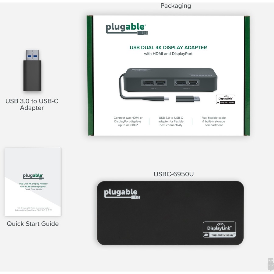 Plugable USB 3.0 and USB-C Dual 4K Display Adapter (USBC-6950U) allows you to connect up to two additional displays that support up to 3840×2160@60Hz resolutions each. Our adapter is compatible with most modern Macs and Windows laptops, desktops and tablets that have a USB 3.0 or USB Type-C or Thunderbolt 3 port.