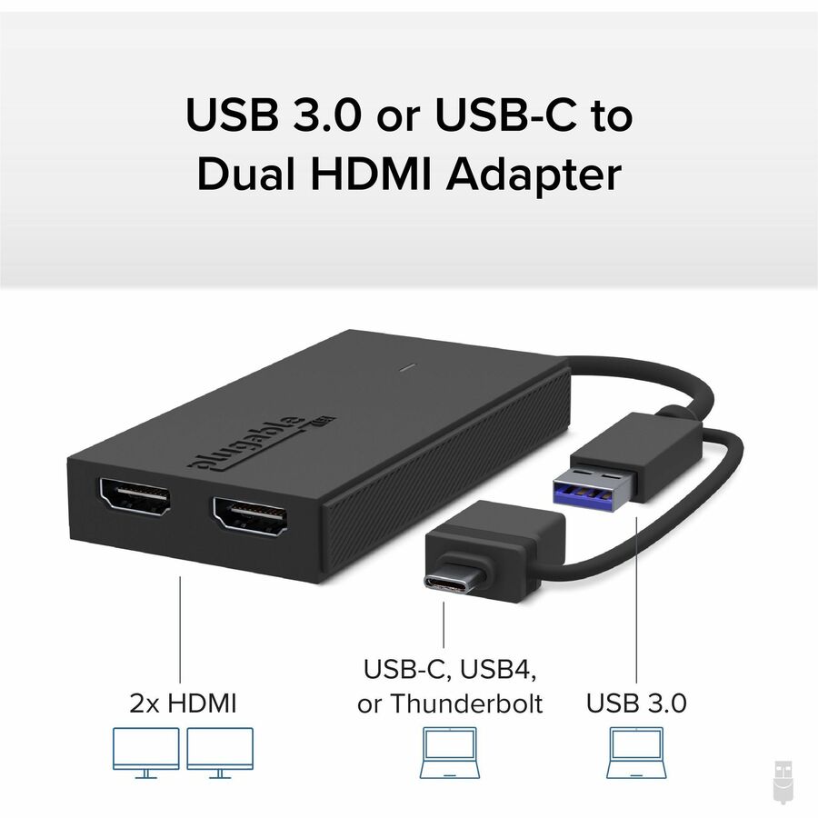 A hybrid 2-in-1 cable takes the guesswork out of picking an adapter that matches your computer-no IT support required. This HDMI dual monitor adapter works with the ports you have now, and the ports you’ll have on your next computer-USB 3.0, USB-C, USB4, even Thunderbolt 3 and Thunderbolt 4. It’s compact, too, so it’s as portable as your laptop.