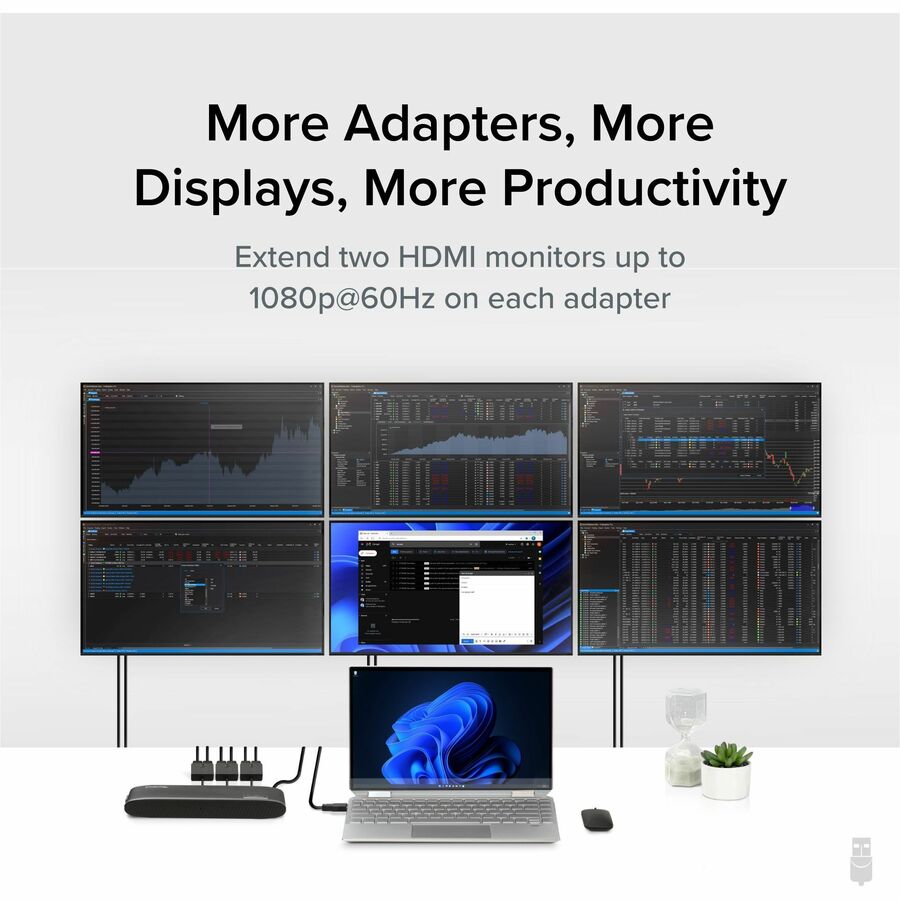 Setting up a productive workstation starts with extra monitors. The Plugable USB 3.0 and USB C to Dual HDMI Video Adapter (UGA-HDMI-2S) keeps things simple. A one plug solution that adds two HDMI ports to your computer, the HDMI monitor adapter leaves your other ports open for peripherals. And because this adapter doesn’t add on extra functionality, it’s a lot more affordable than a docking station-something your purchasing manager will appreciate.